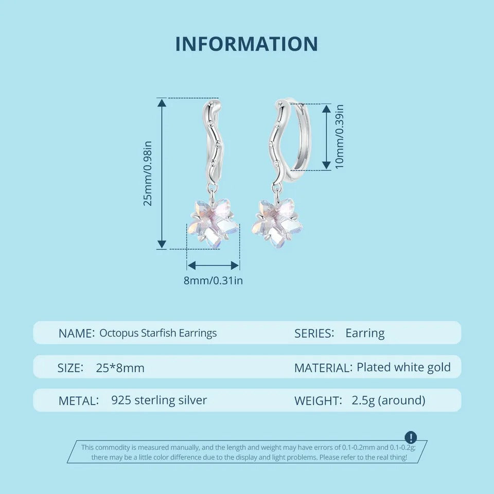 Description The earrings embedded with starfish shape glass is playful and whimsical as multiple coils of octopus tentacles being wrapped around. It symbolizes wealth from all directions as well as representing the beautiful meaning of absolute freedom and prosperity.