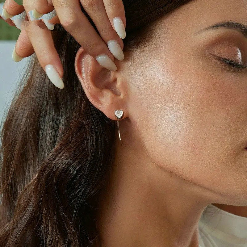 Description The heart stud earrings with long pins design delicate and unique. Classic shape of heart make them sweet and charming.